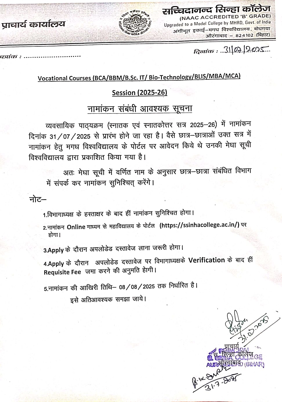 NOTICE REGARDING FOR VOCATIONAL ADMISSION (UG- 2025-28) & (PG- 2025-27)